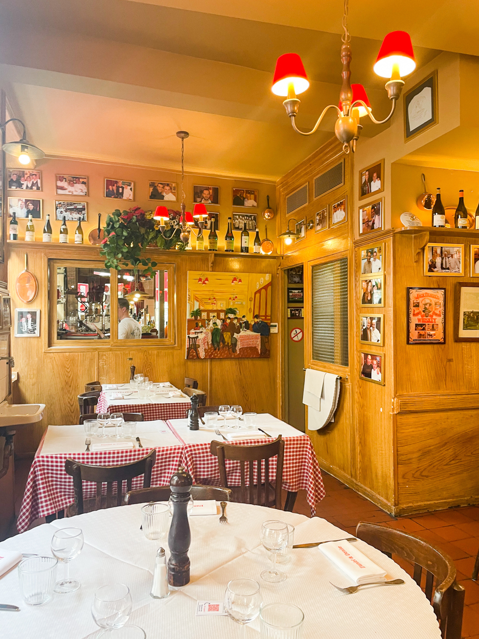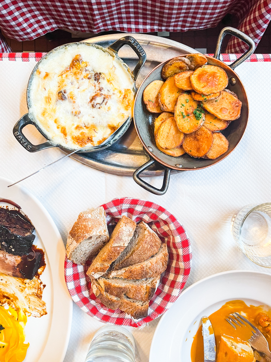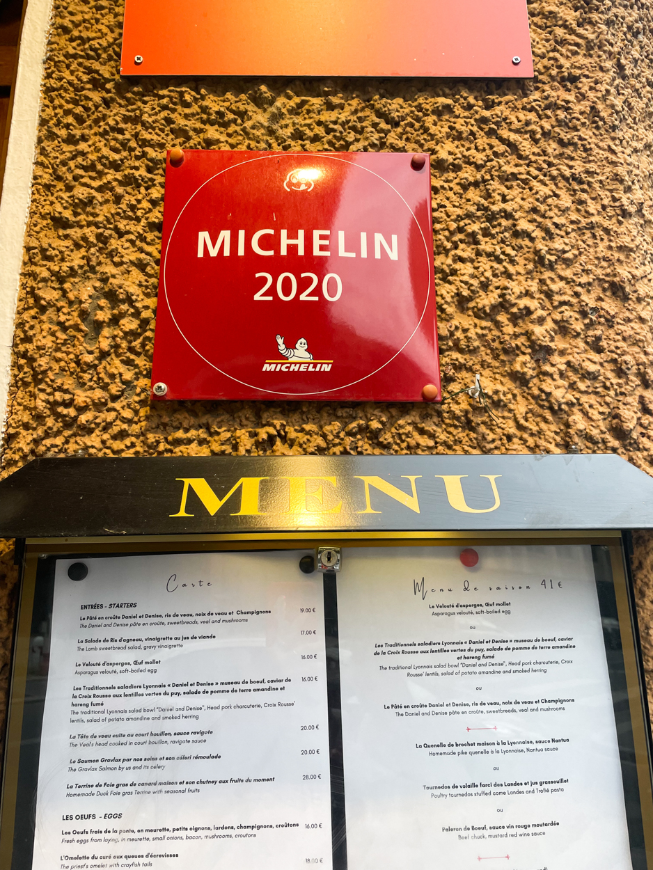 Lyon is known for its gastronomy, so I had researched some “bouchons,” restaurants serving local Lyonnais food, often heavy on meat. I made a 7pm reservation at Daniel et Denise Créqui, which is a Michelin Guide restaurant. I think they opened at 7pm and we were one of the first parties to be seated. I believe there were a couple of locations, but the Créqui one looked the most traditional from the photos I saw online. I loved the red checkered tablecloth and the cozy aesthetic inside. From where I was sitting, I had a view of the cooks in the kitchen who were wearing those tall white chef hats. We were in good foodie company. There was an older couple at the table next to us and the man was taking photos of all his food #relatable.