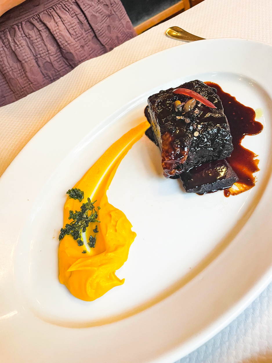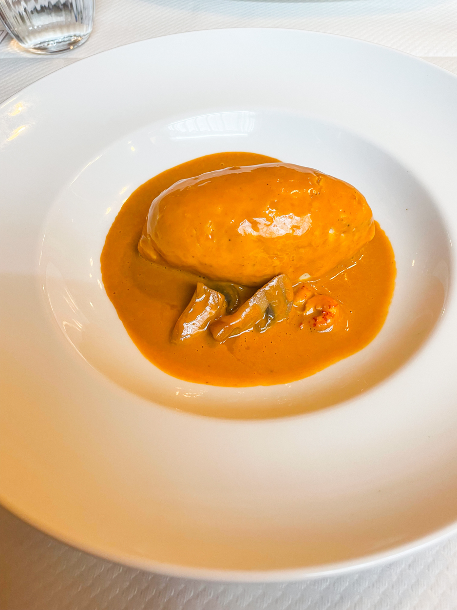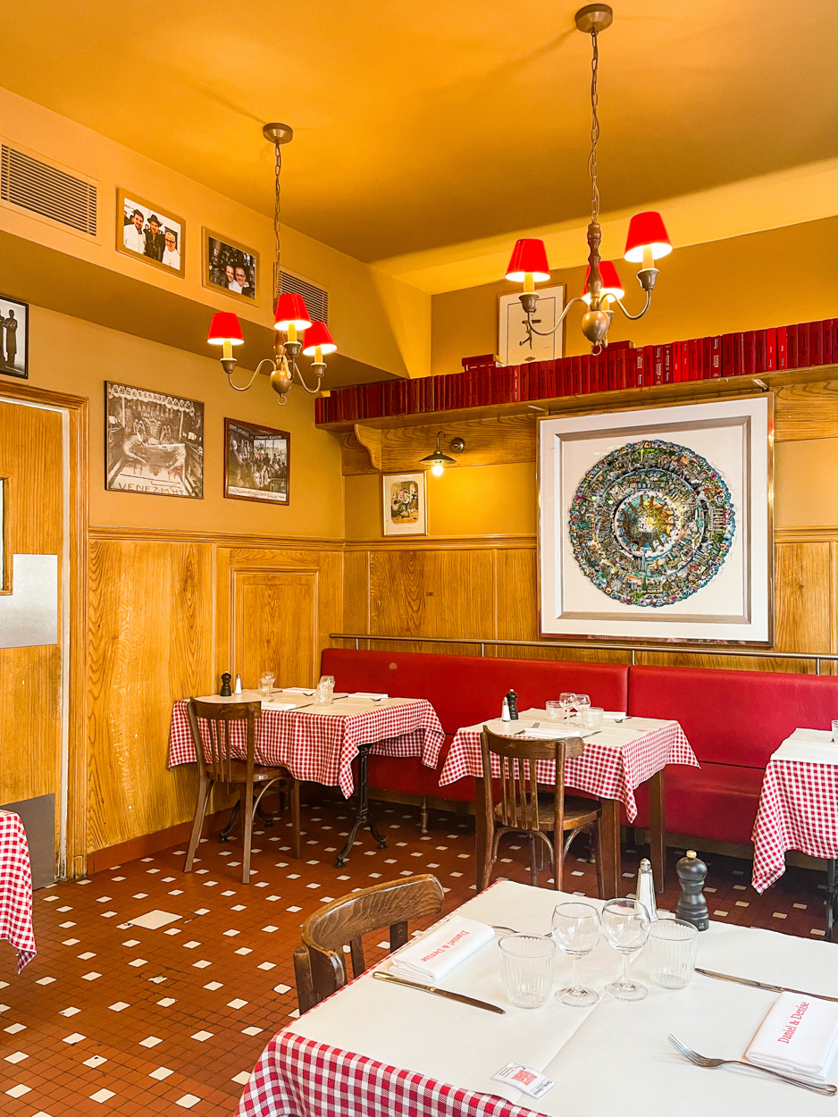 Lyon is known for its gastronomy, so I had researched some “bouchons,” restaurants serving local Lyonnais food, often heavy on meat. I made a 7pm reservation at Daniel et Denise Créqui, which is a Michelin Guide restaurant. I think they opened at 7pm and we were one of the first parties to be seated. I believe there were a couple of locations, but the Créqui one looked the most traditional from the photos I saw online. I loved the red checkered tablecloth and the cozy aesthetic inside. From where I was sitting, I had a view of the cooks in the kitchen who were wearing those tall white chef hats. We were in good foodie company. There was an older couple at the table next to us and the man was taking photos of all his food #relatable.