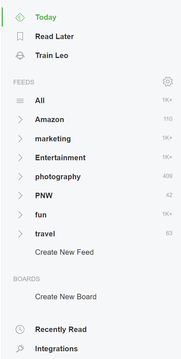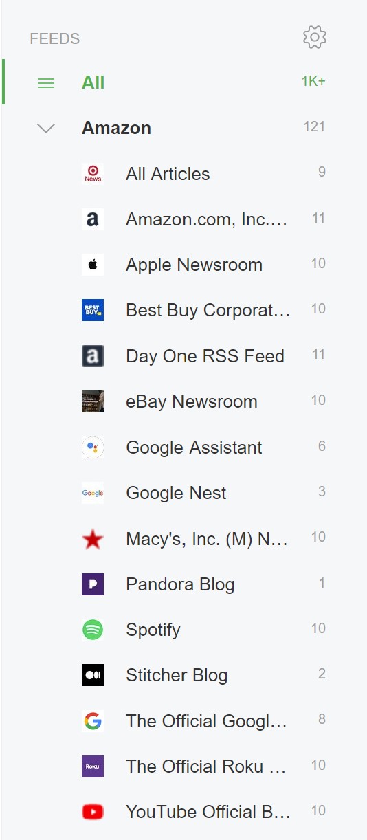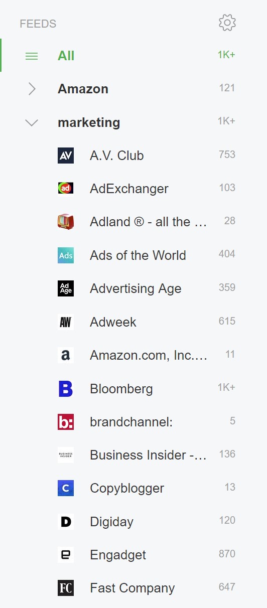 I usually just look at my general Amazon feed to keep up with all the competitors, but it’s easy to click on the Target blog if I want to just see Target’s updates. However, I don’t only want to keep track of what Amazon’s competitors are doing, I also want to see what other brands are doing in general, so I created a marketing feed as well. I also use Feedly just for fun, so I made feeds for the entertainment trades and photography and travel blogs.