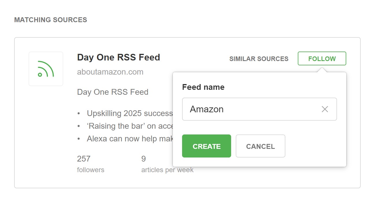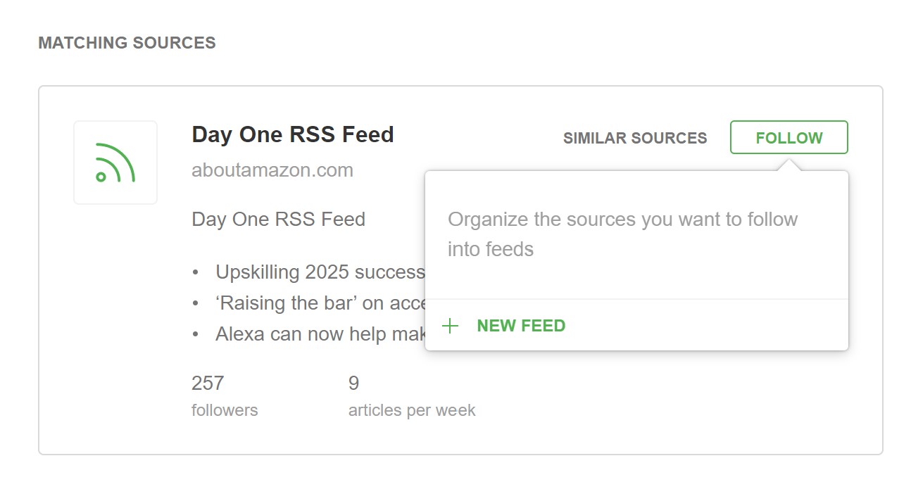 4. Click Follow then create and name your feed. Your feed will now show up on the left-hand menu and you can click into each website to see an individual publisher’s content.
